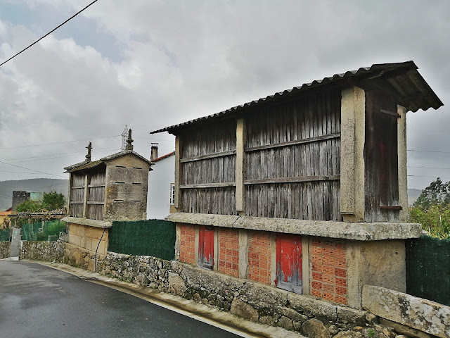 Por delante mía y a lo lejos caminan dos peregrinos que me han adelantado en mi pausa de la cafetería, y que he perdido de vista cuando me he detenido en un área de descanso junto al Río Roxo que ya conocía, solo que hoy lo descubrí desapacible y gris sombrío, y eché en falta unos arboles cruzados sobre el río que entonces dibujaban una enorme "X". Se encuentra a pie de un Puente Medieval y cuenta con un par de merenderos. En verano es una delicia para comerse el bocadillo junto al agua. Este lugar forma parte de una ruta fluvial llamada Rego dos Roxos con puntos interesantes en su recorrido, por ejemplo el Petroglifo do Souto (entre otros petroglifos enclavados en la misma zona), un vestigio pétreo de la edad del bronce cuyo descubrimiento en 2017 puso en jaque el desarrollo de la zona al encontrarse donde estaba proyectada la construcción de una depuradora.